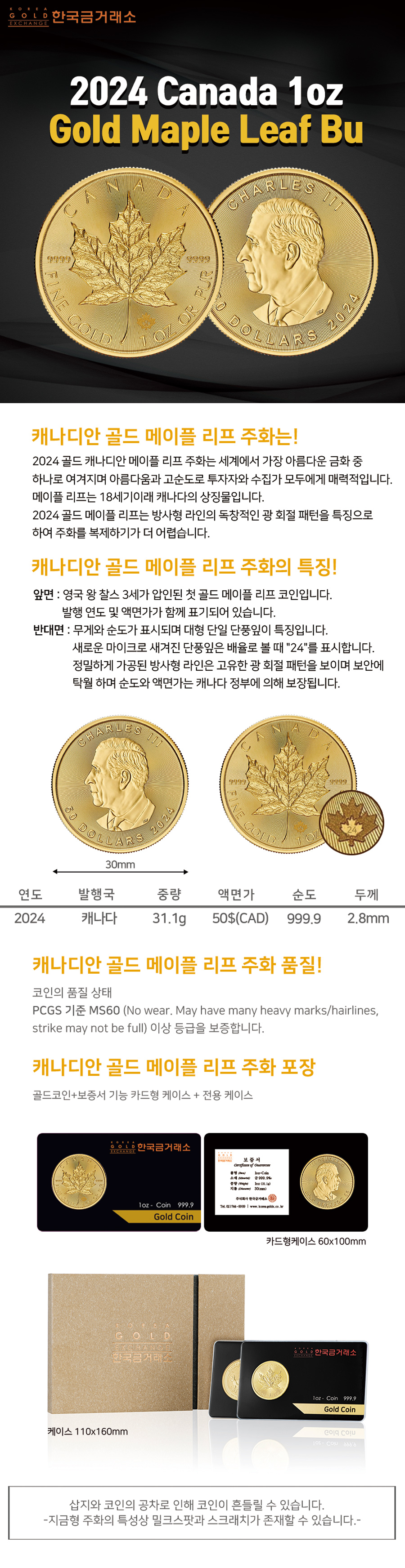 • 2024 1온스 골드 메이플 리프 불리온 주화(Coin) 50$(CAD)