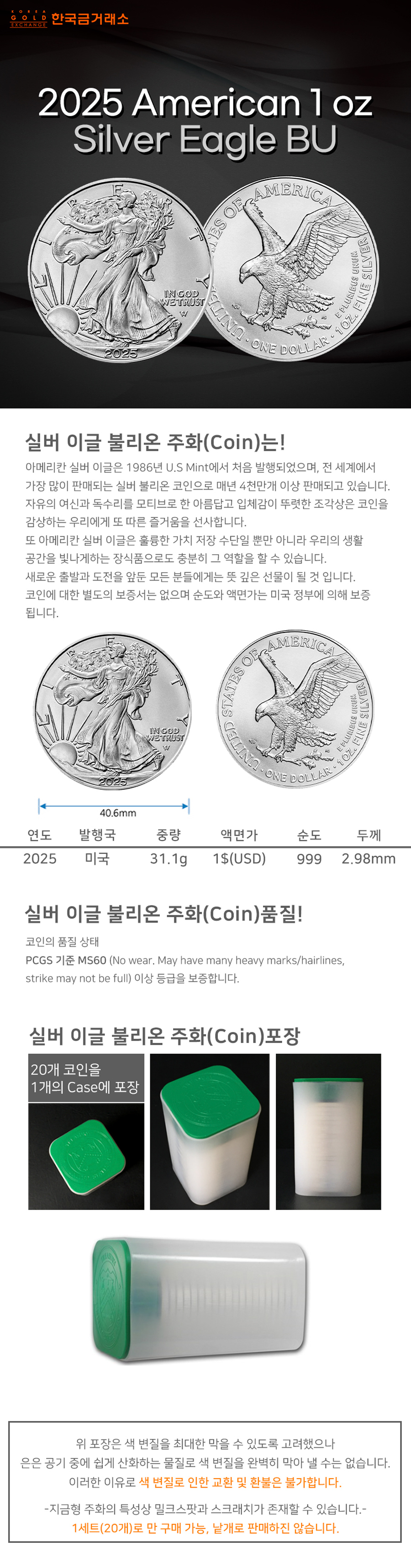 • 2025 1온스 실버 이글 불리온 주화(Coin) 1$(USD) 20ea